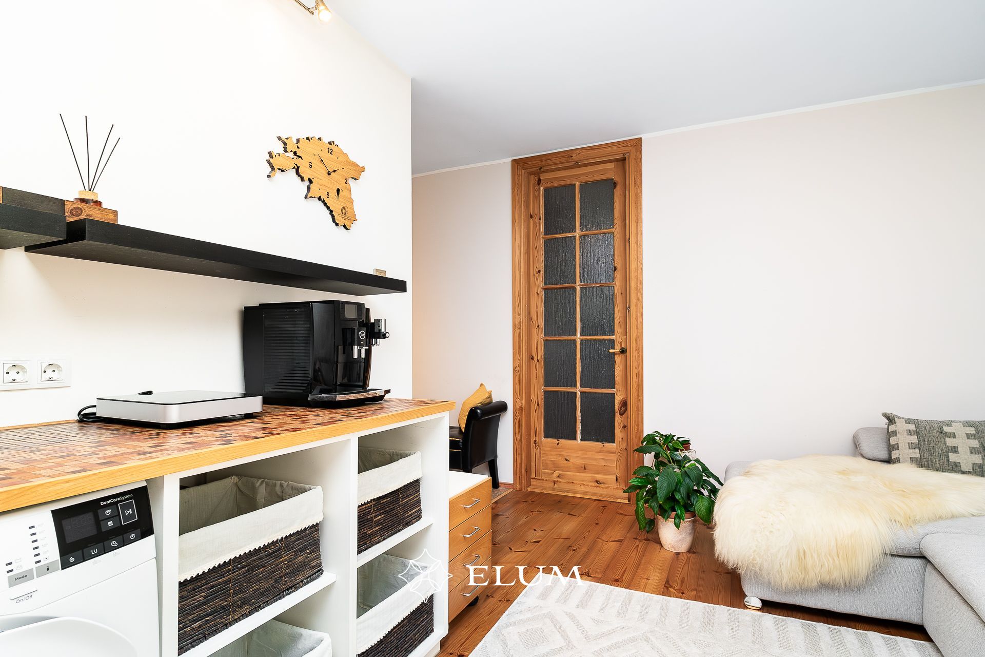The original layout of this apartment has been updated: the kitchen has been moved to the living room, which opens to the evening sun, while the former bathroom now features a shower and an electric sauna with underfloor heating option. The toilet has been built in the former kitchen space. The entrance hall includes a built-in wardrobe, and the living room opens onto a balcony. Both the living room and bedroom floors are covered with oiled wooden flooring. Tall wooden interior doors (2.4 m) add a sense of elegance and spaciousness.