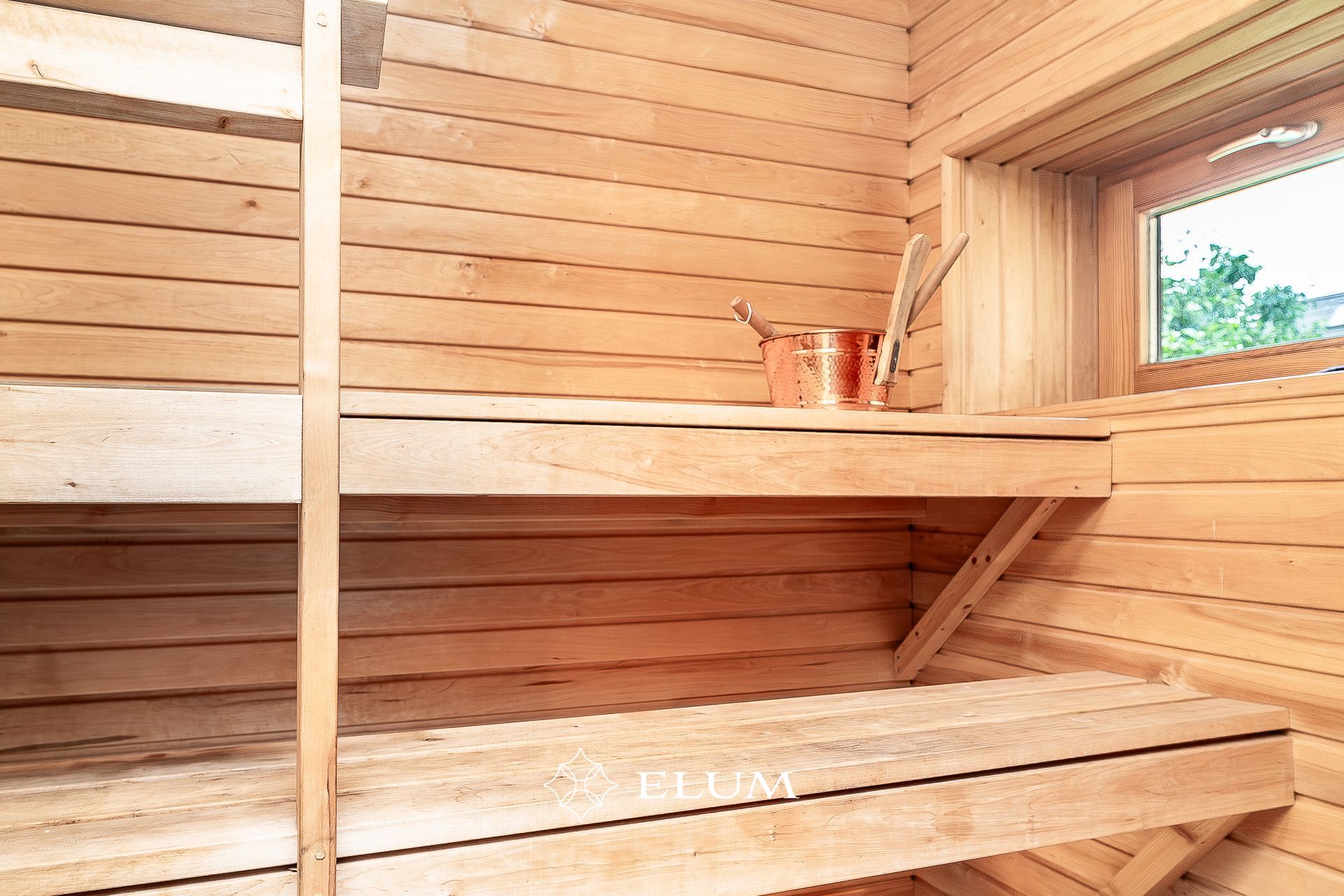 On the ground floor, there is a spacious staircase hall that extends through both floors, allowing plenty of natural light into the house. The kitchen with a dining area, the cosy living room and the glass-walled side room resembling a winter garden create an open and bright living environment. The ground floor also includes a wood-heated sauna, a bathroom, a toilet and a heated garage with a technical room.