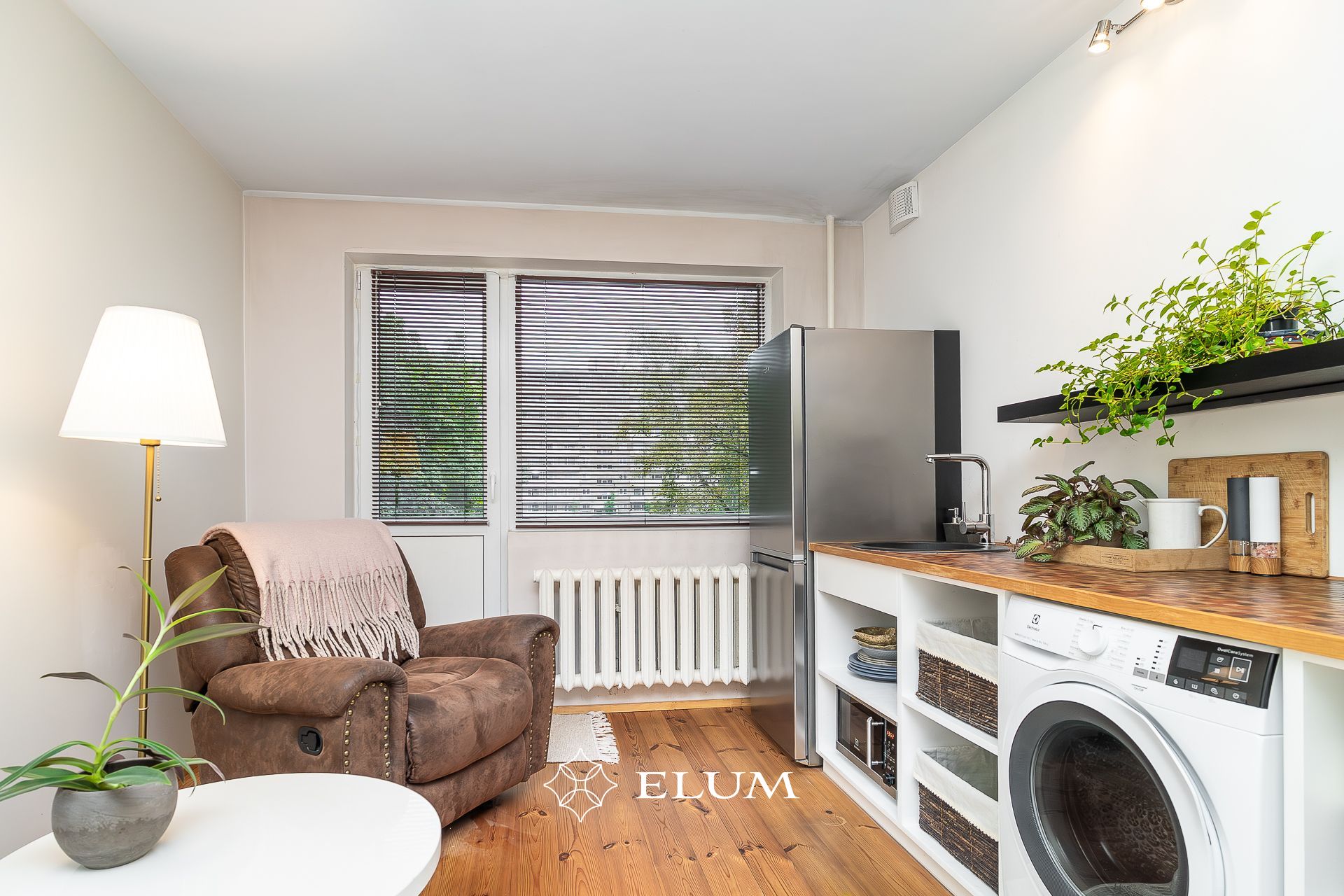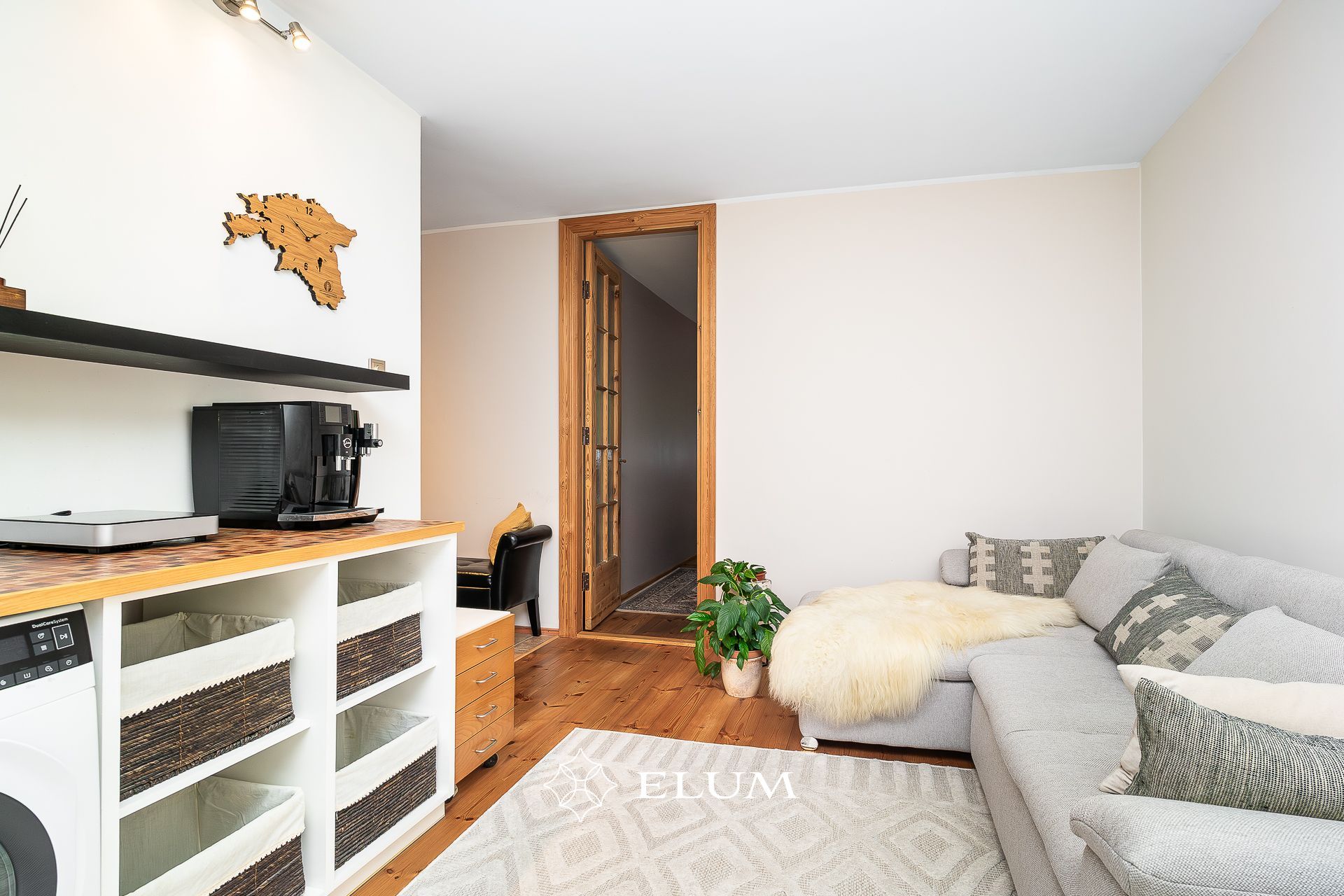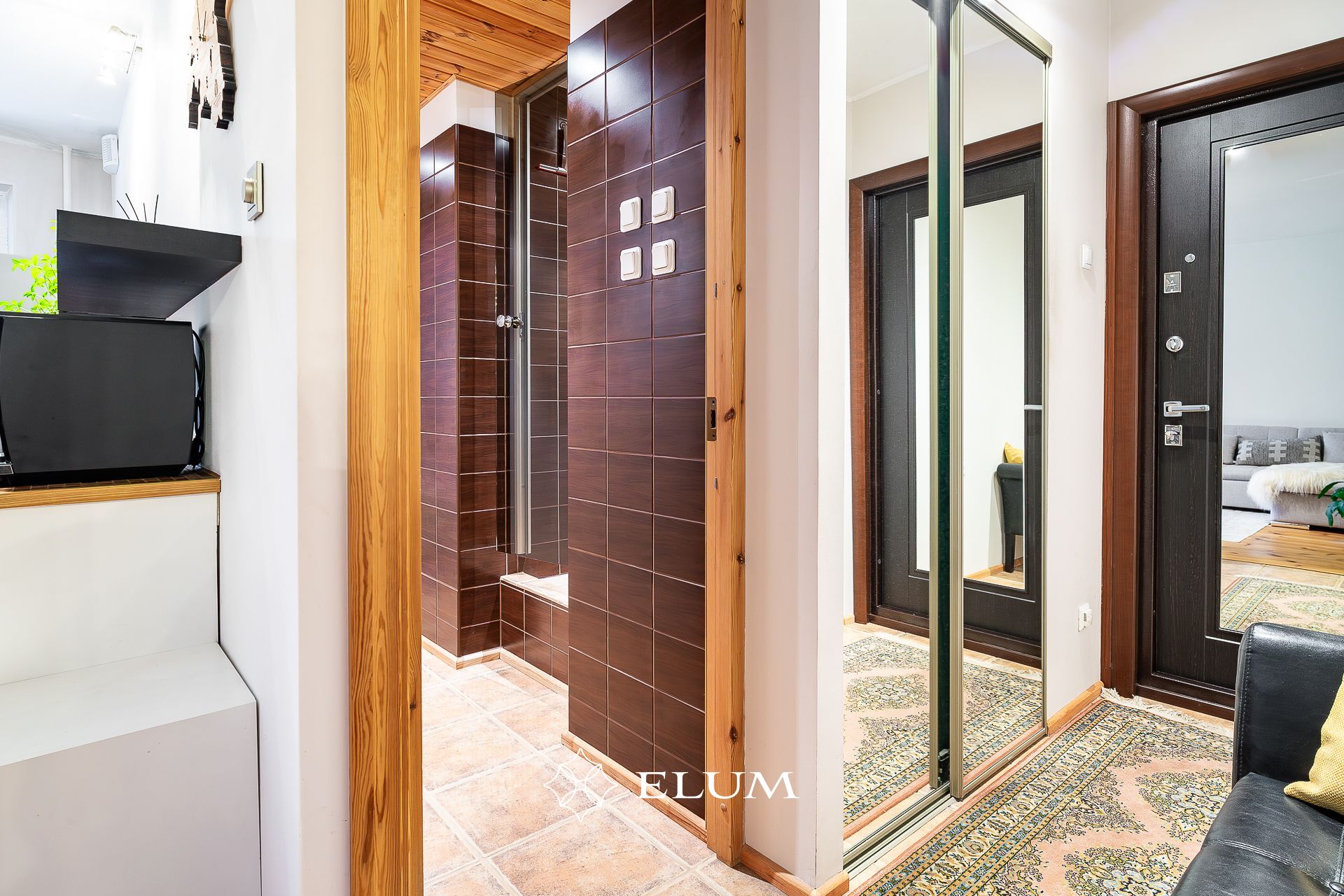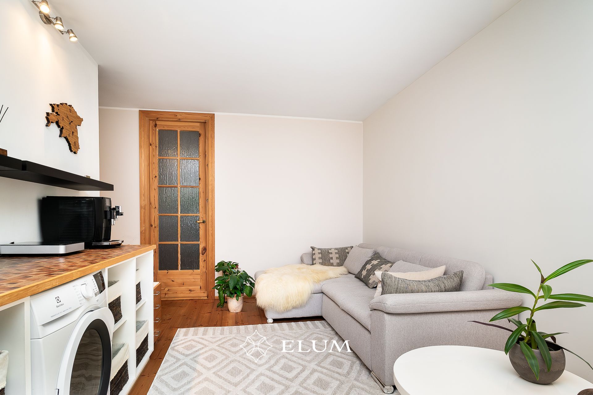 The original layout of this apartment has been updated: the kitchen has been moved to the living room, which opens to the evening sun, while the former bathroom now features a shower and an electric sauna with underfloor heating option. The toilet has been built in the former kitchen space. The entrance hall includes a built-in wardrobe, and the living room opens onto a balcony. Both the living room and bedroom floors are covered with oiled wooden flooring. Tall wooden interior doors (2.4 m) add a sense of elegance and spaciousness.