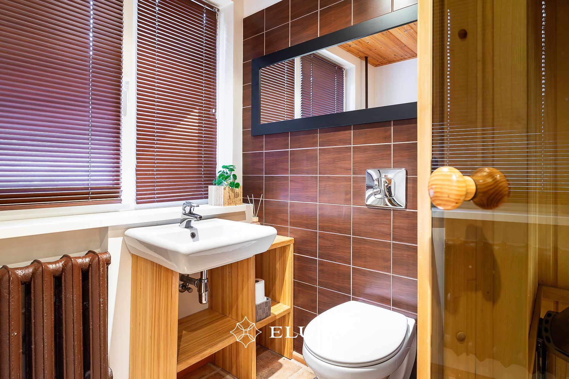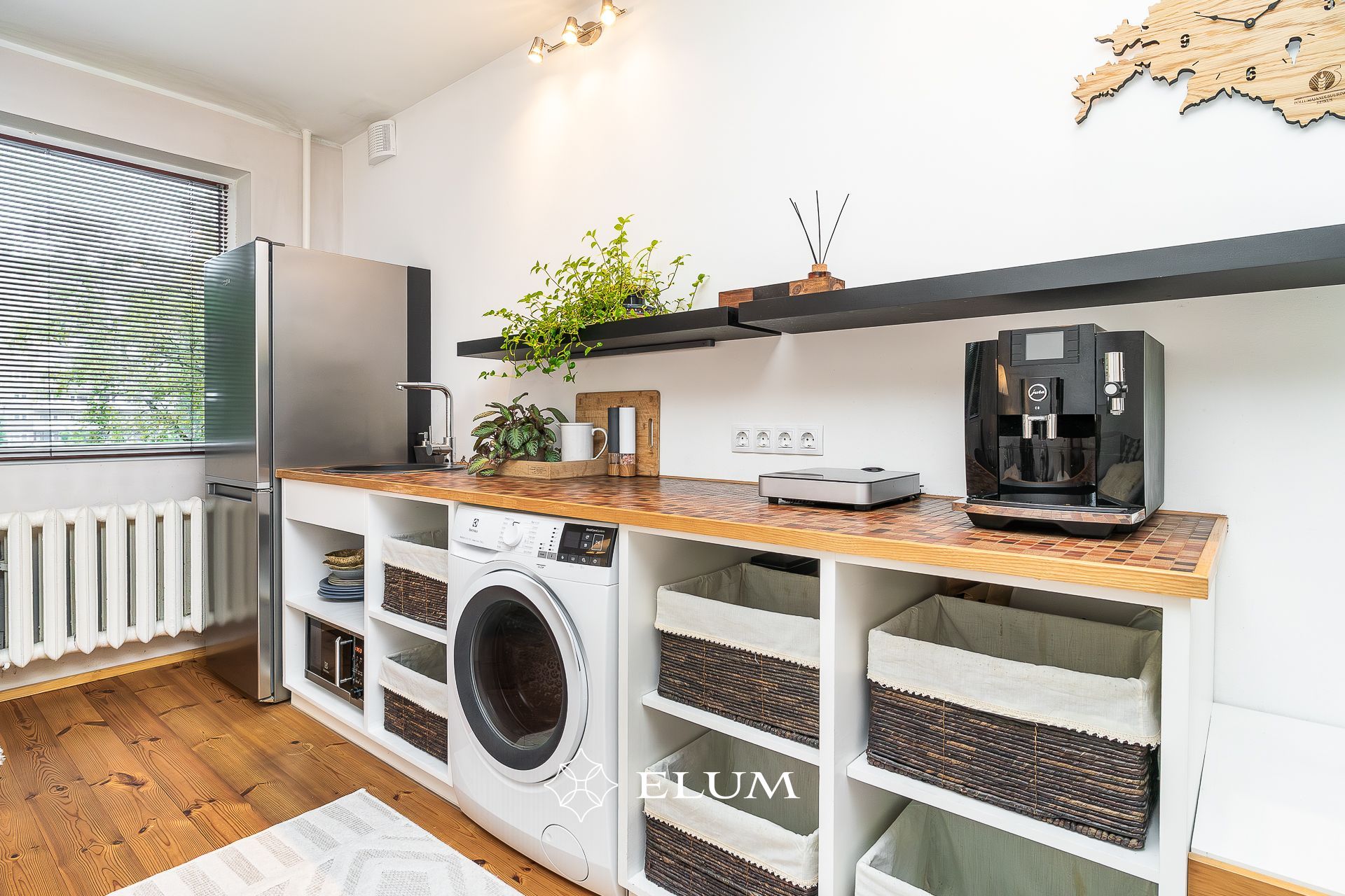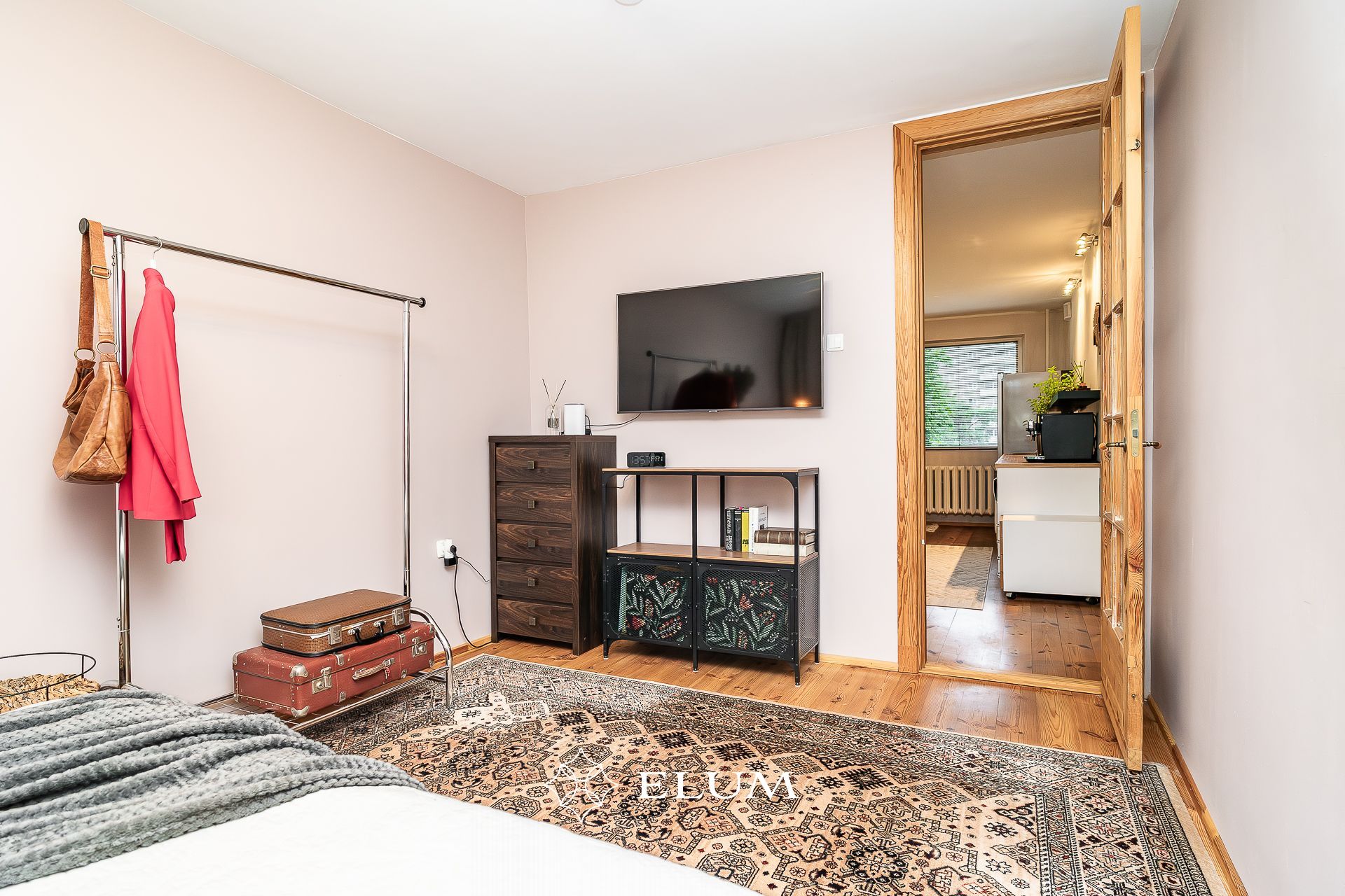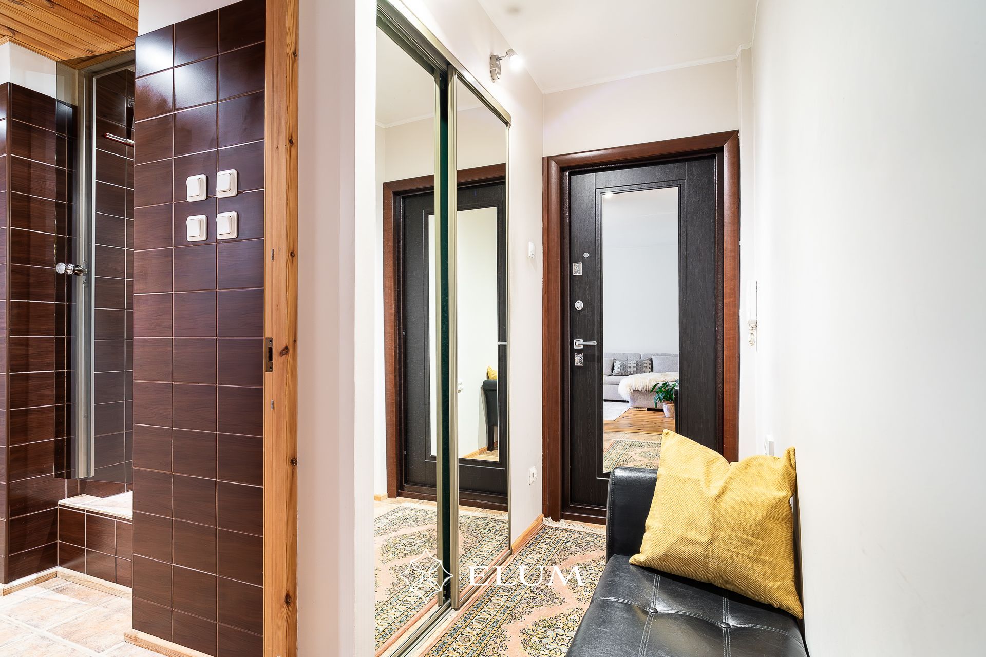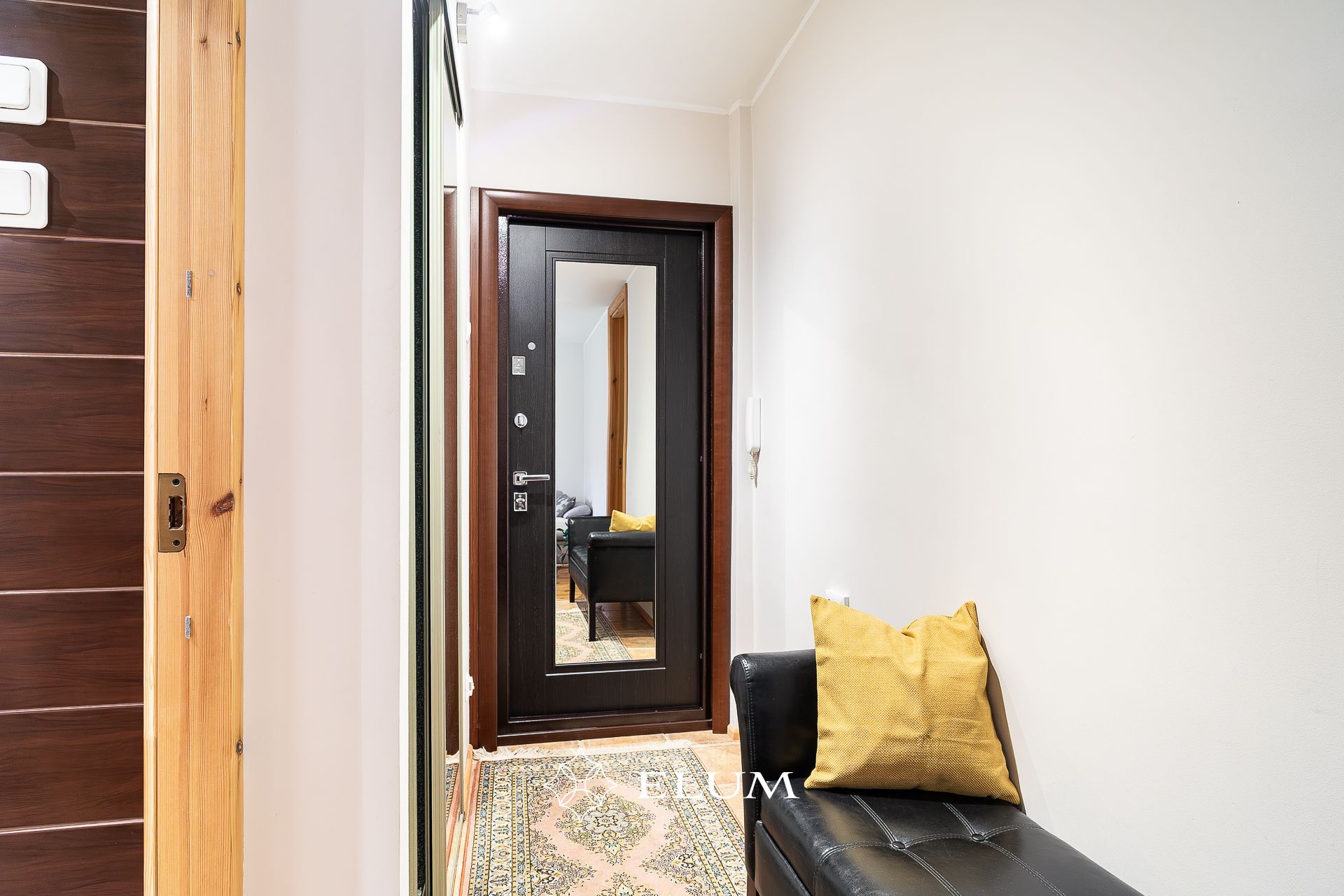 The original layout of this apartment has been updated: the kitchen has been moved to the living room, which opens to the evening sun, while the former bathroom now features a shower and an electric sauna with underfloor heating option. The toilet has been built in the former kitchen space. The entrance hall includes a built-in wardrobe, and the living room opens onto a balcony. Both the living room and bedroom floors are covered with oiled wooden flooring. Tall wooden interior doors (2.4 m) add a sense of elegance and spaciousness.