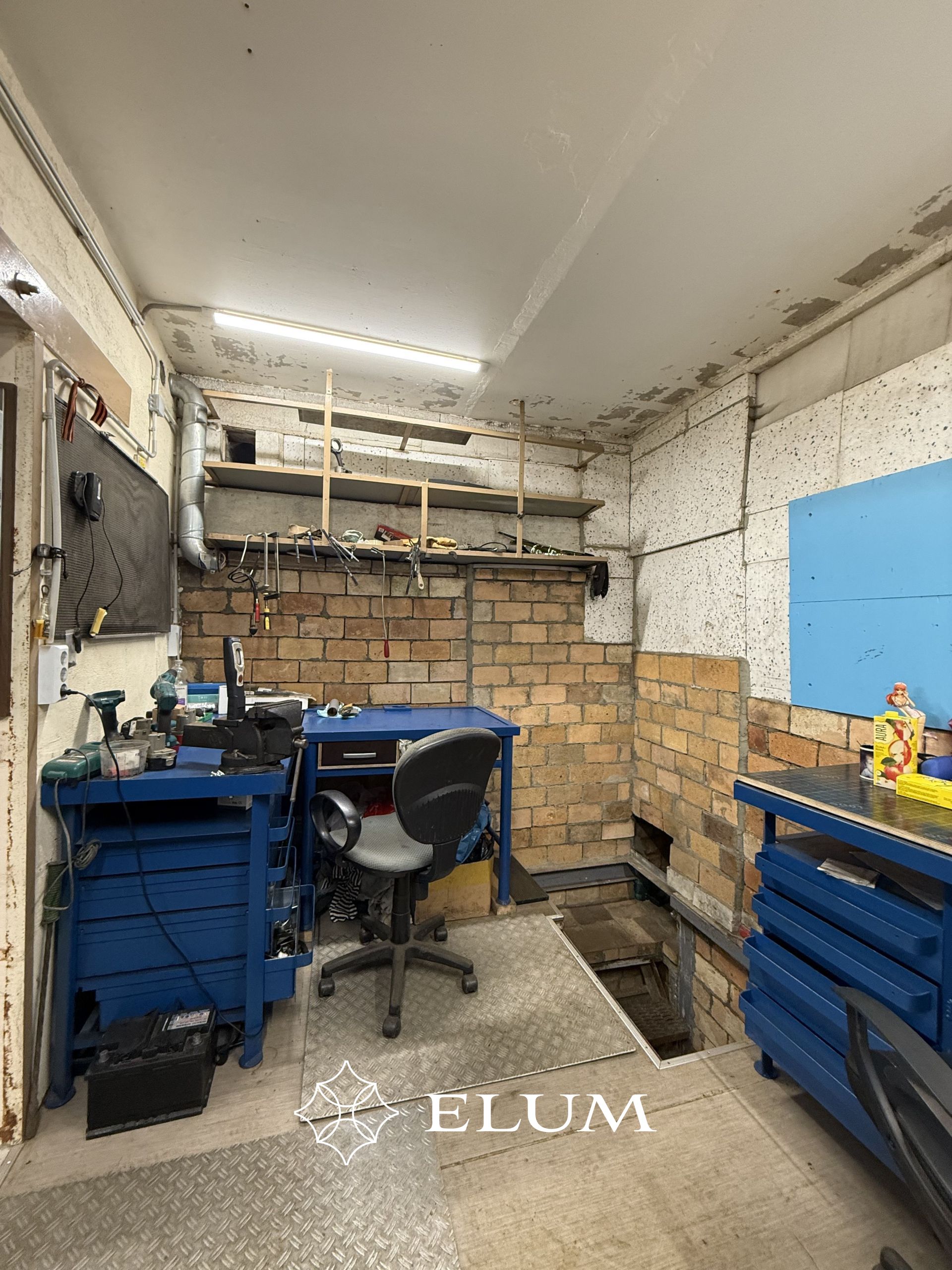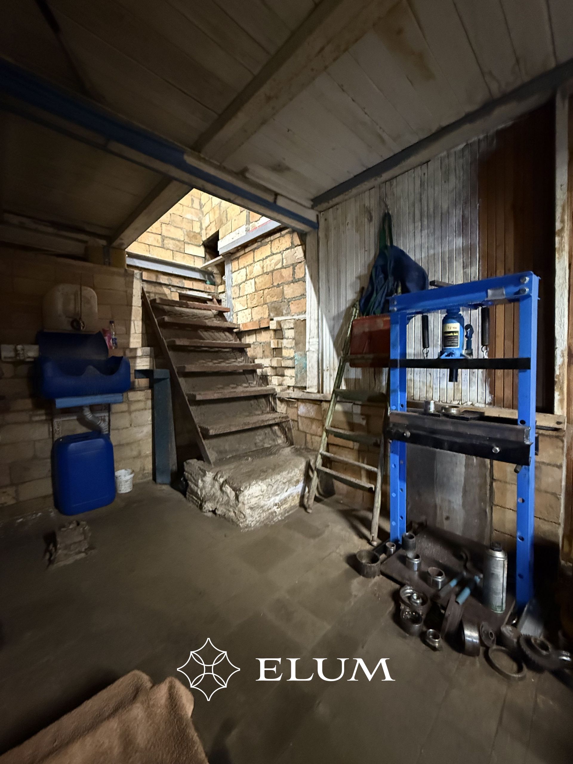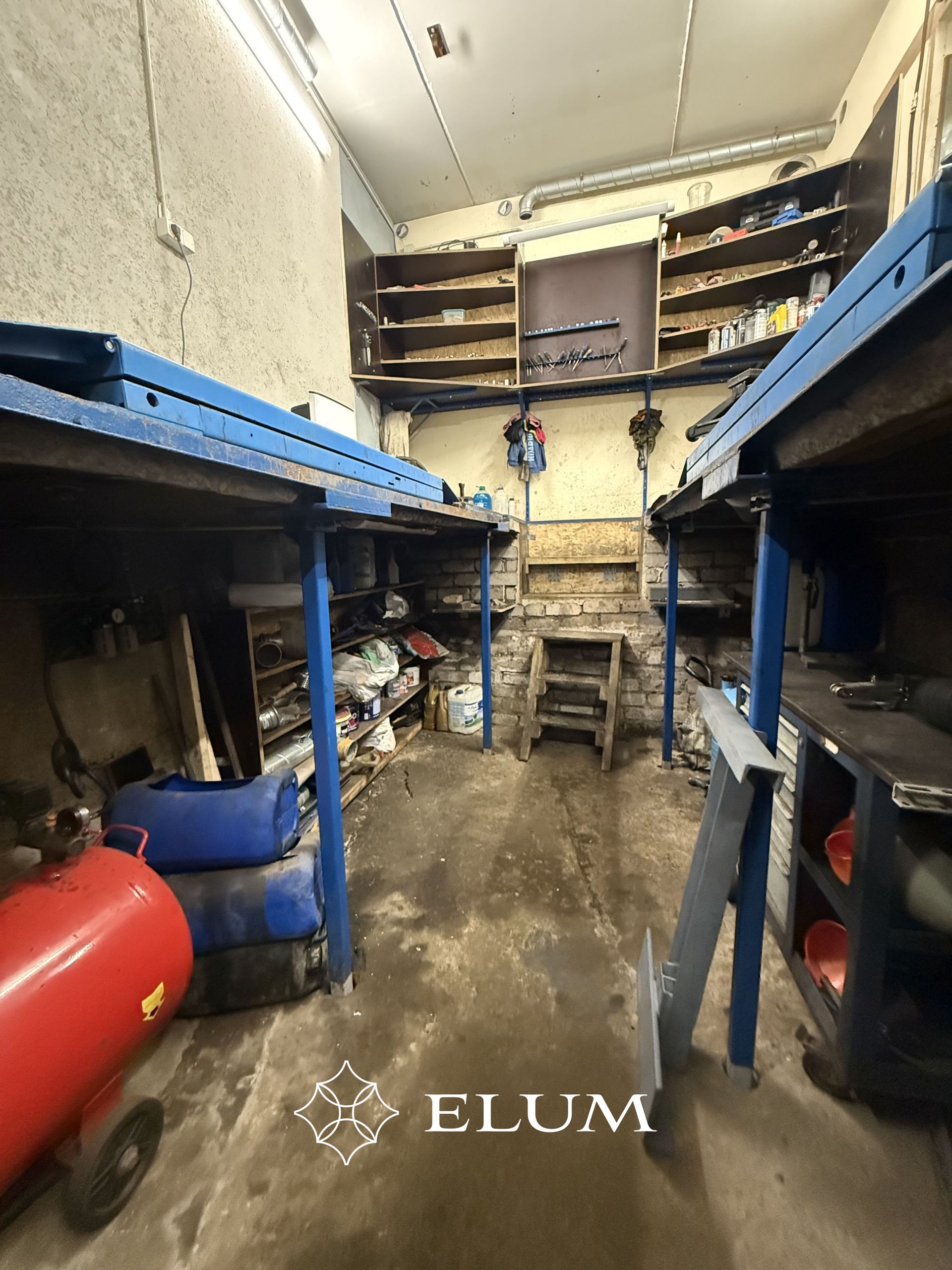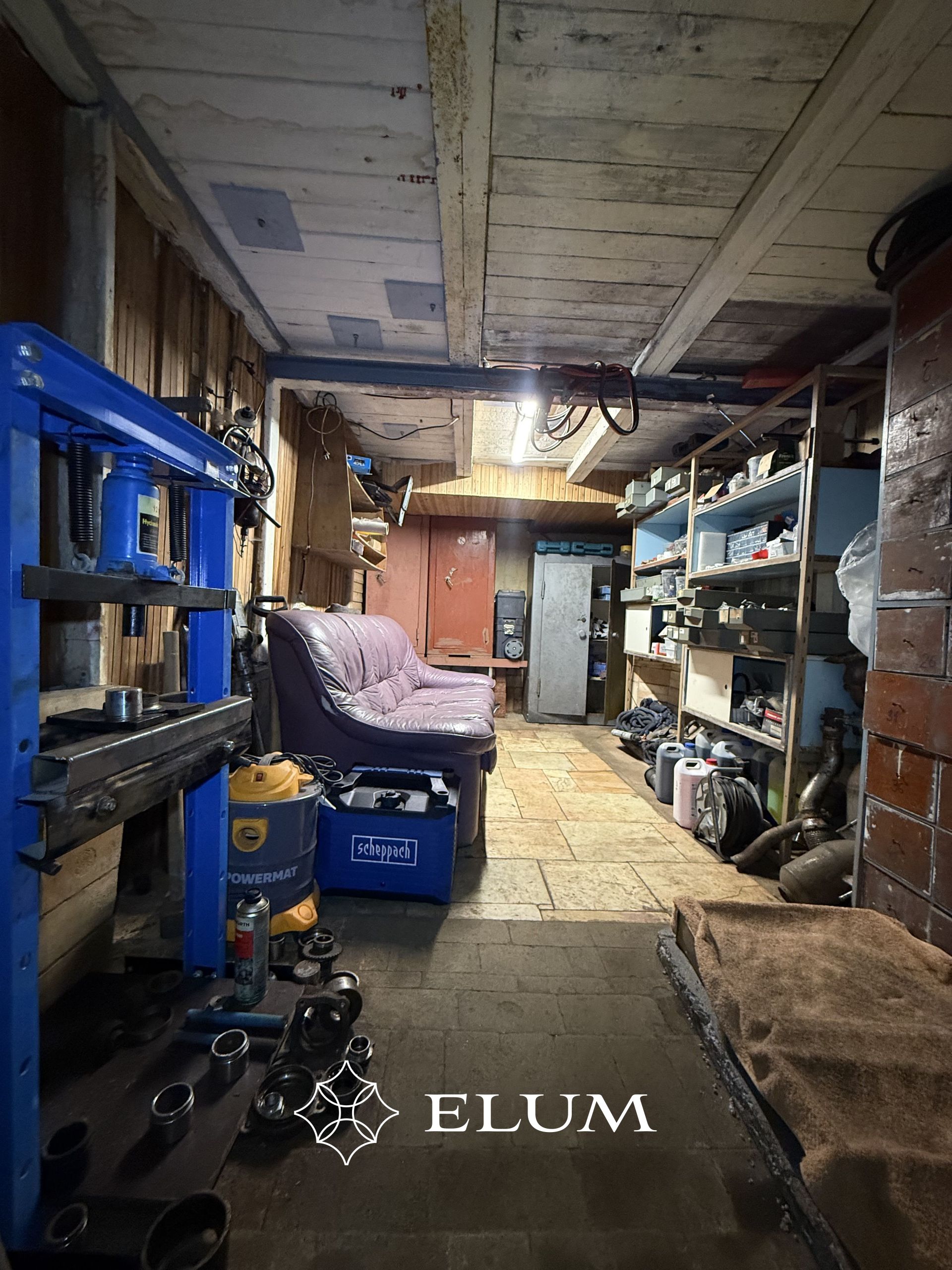 Esimese boksi all on täiendav ruum ladustamiseks ja puhkenurk suure diivaniga. Samuti asub seal 12-tonnine press, kraanikauss, valgustus ja pistikupesad.