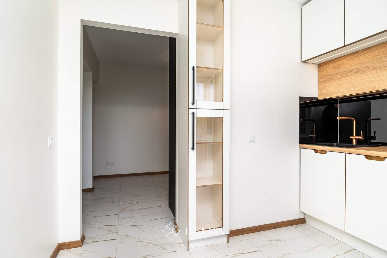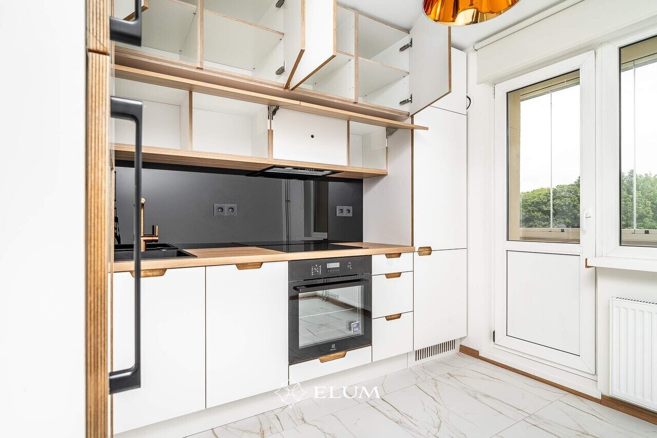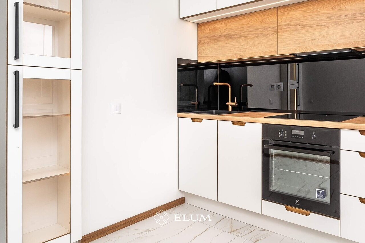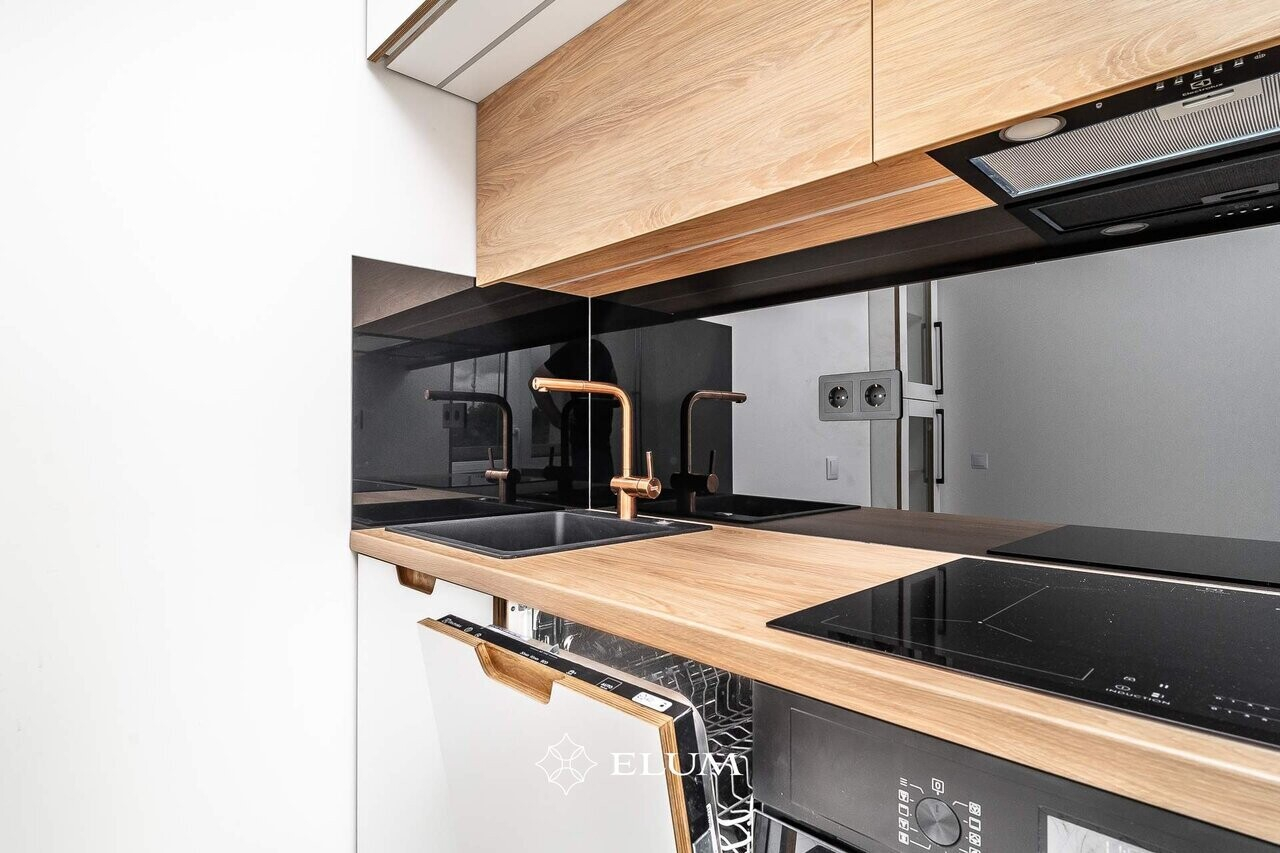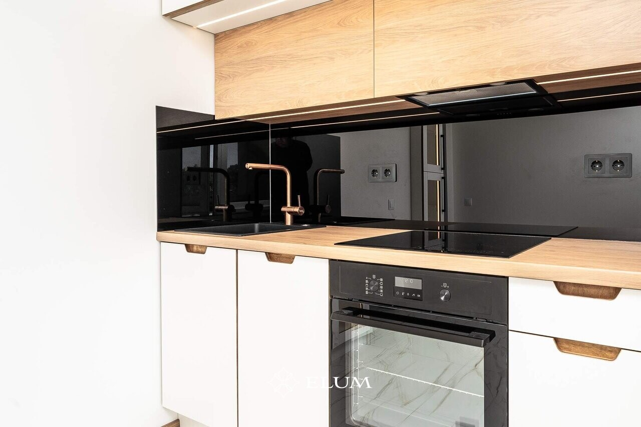 Valmistatud köök hoiab minimalistlikku joont, kuid tänu kasutatud materjalidele on soe ja hubane element korteri interjööris.