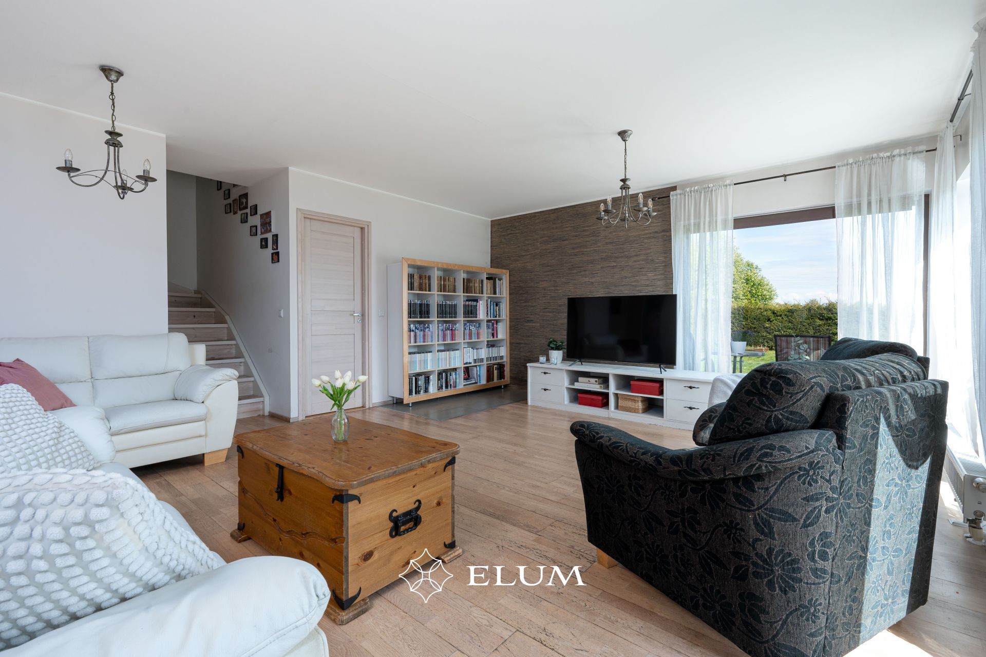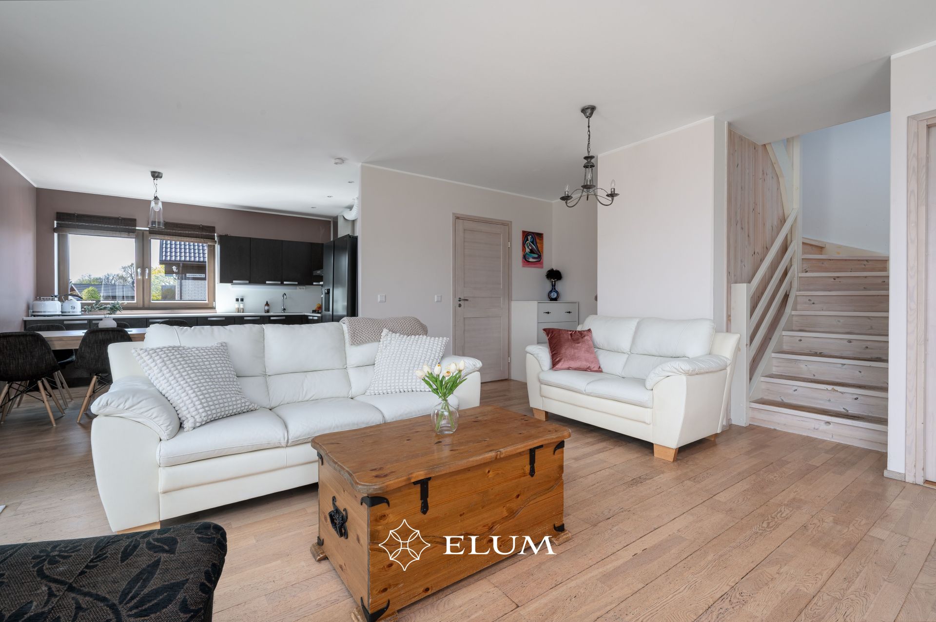 Siseviimistlus on heledates toonides: täispuidust tammeparkett, täispuidust siseuksed, kahekordsed puitpakettaknad. Sanitaarruumid on plaaditud. Korruseid ühendab täispuidust trepp.