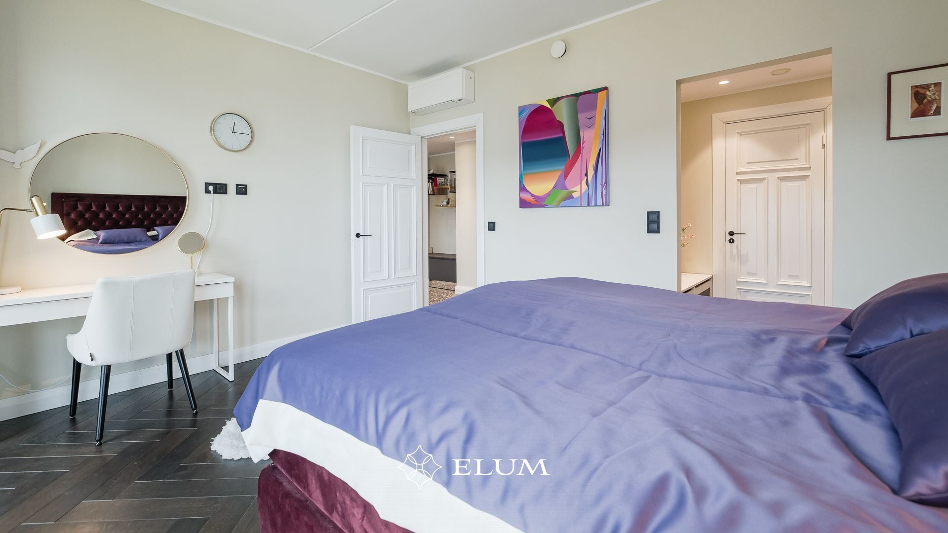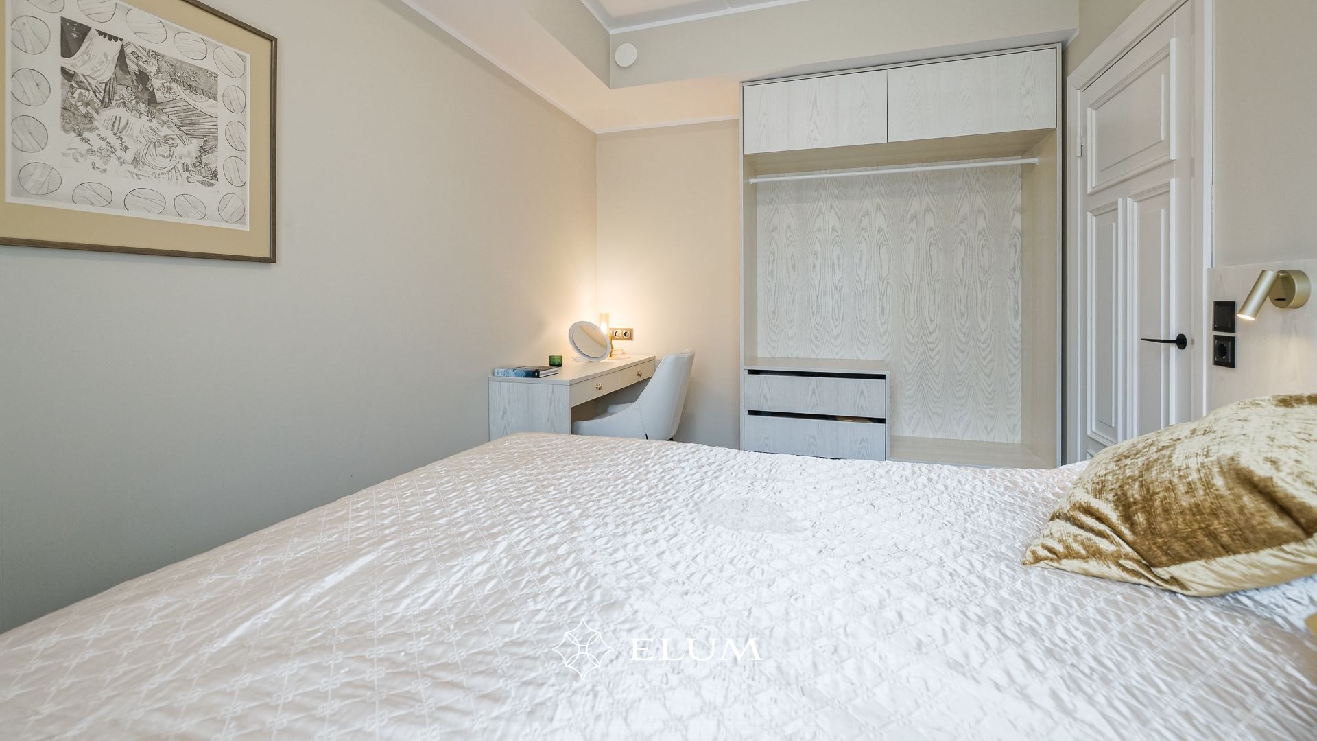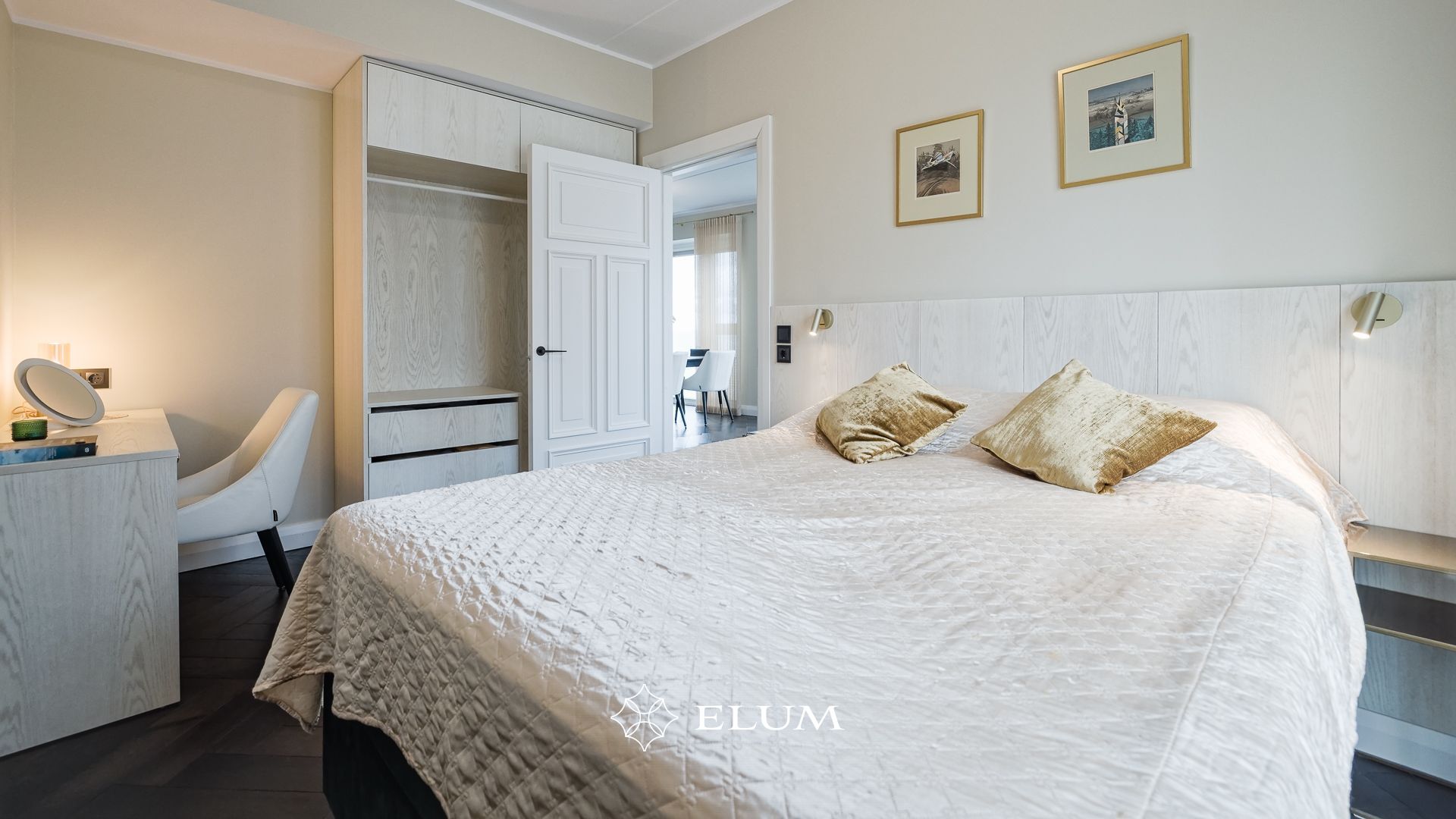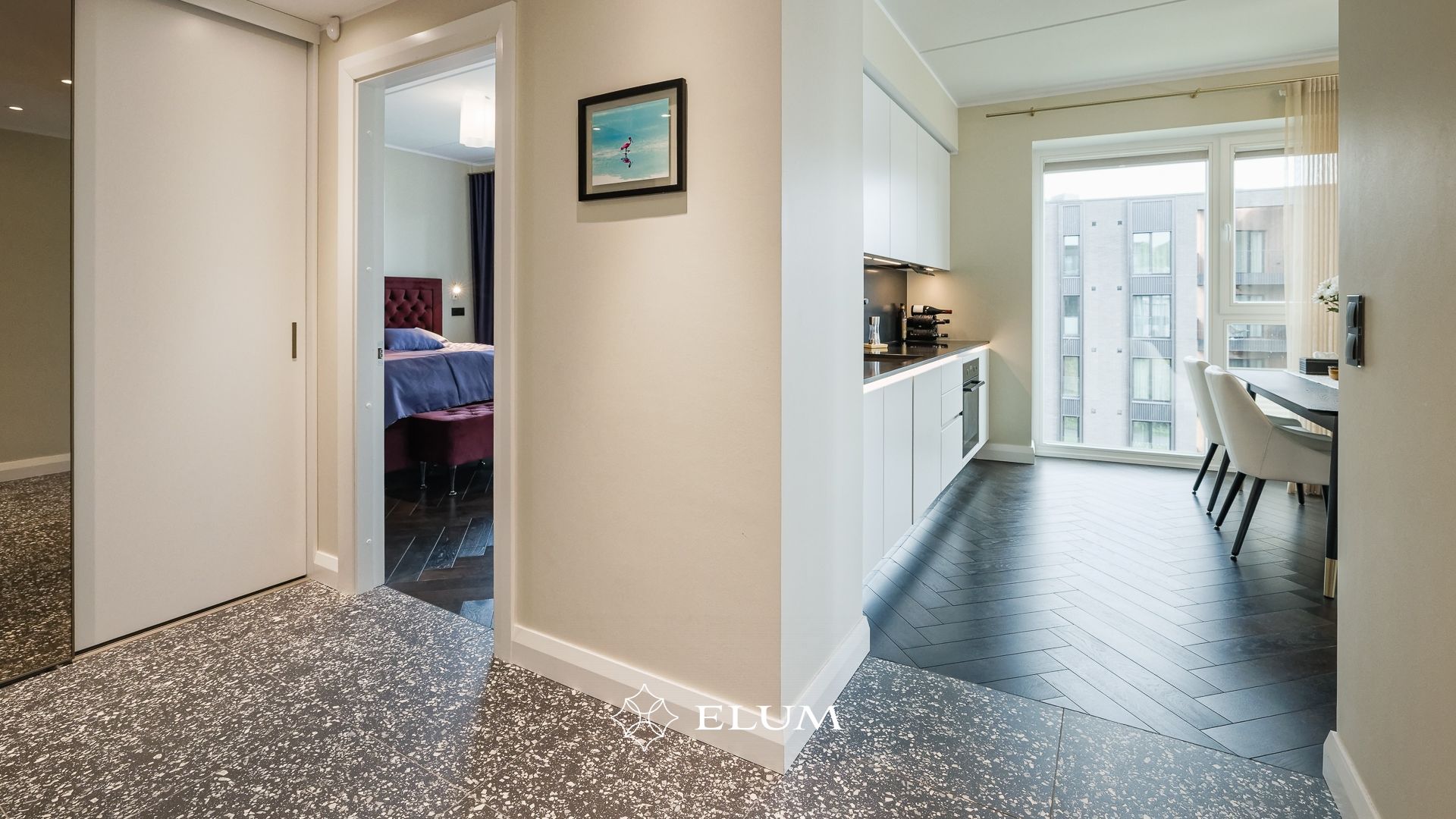 Sisenedes avarasse ja valgusküllasesse esikusse, leiab kohe integreeritud garderoobi, mis aitab hoida ruumi korras ja organiseerituna. Suured, maast laeni peegelpinnad loovad esikust veelgi avarama mulje. Privaatsest magamistoast avaneb vaade merele ja pääseb walk-in garderoobi ning vannituppa.