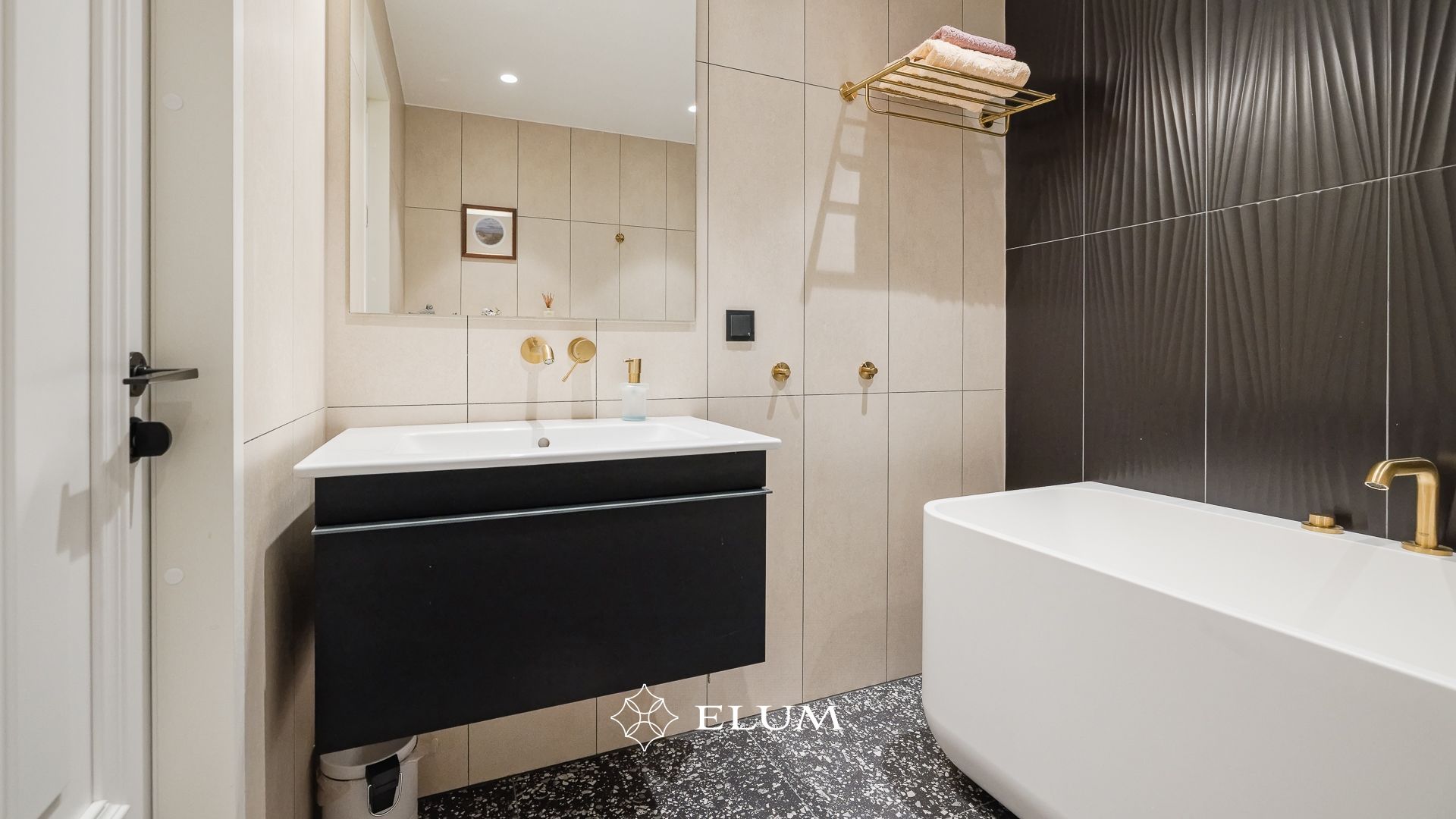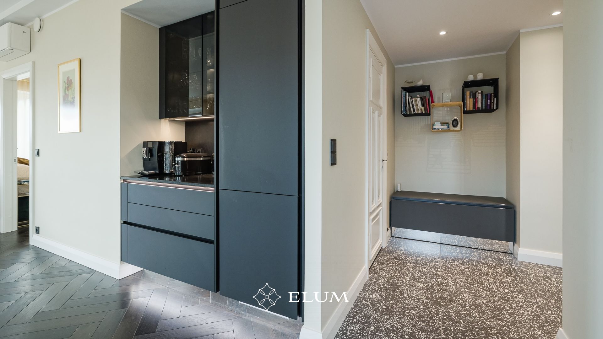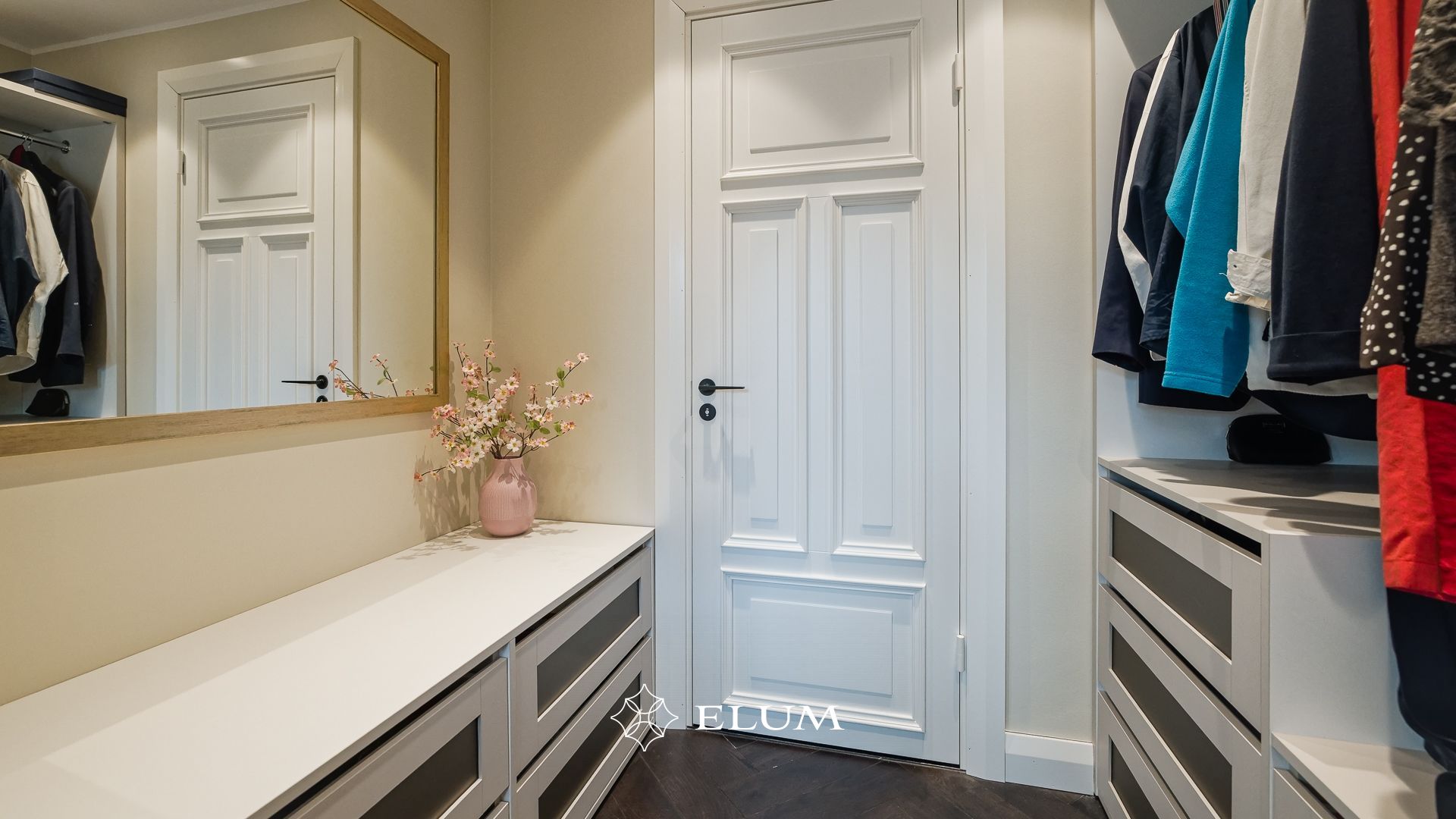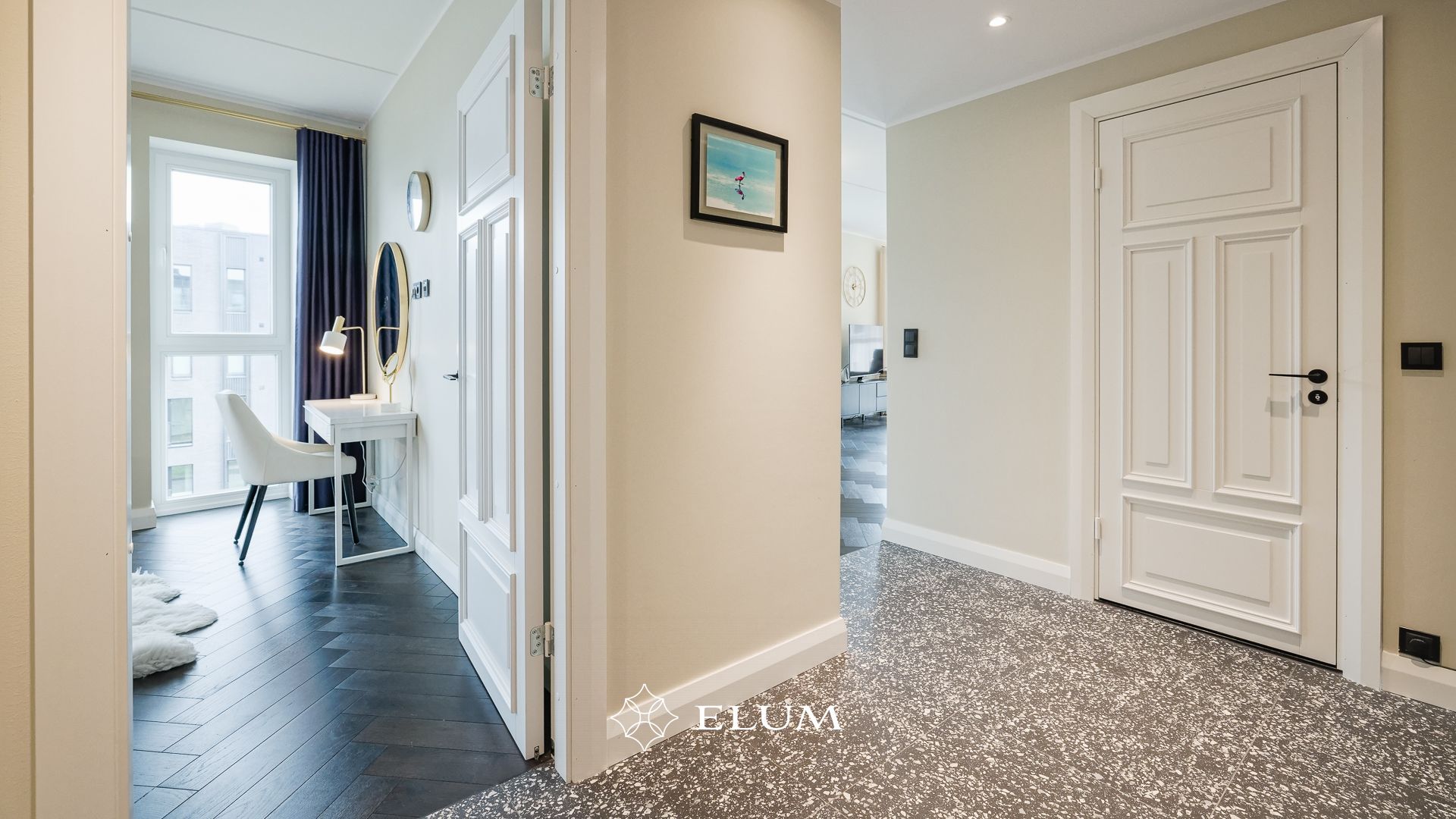Sisenedes avarasse ja valgusküllasesse esikusse, leiab kohe integreeritud garderoobi, mis aitab hoida ruumi korras ja organiseerituna. Suured, maast laeni peegelpinnad loovad esikust veelgi avarama mulje. Privaatsest magamistoast avaneb vaade merele ja pääseb walk-in garderoobi ning vannituppa.