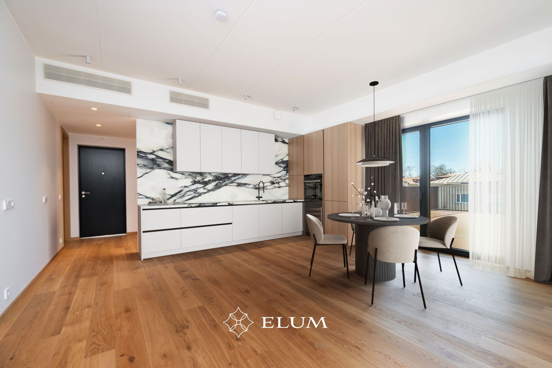 Korteri südameks on avara planeeringuga elutuba, mida kroonib päikeseküllane 42,9 m² terrass ning lisaks 4,2 m² rõdu – ideaalne kombinatsioon nii hommikukohviks kui õhtuseks lõõgastumiseks.